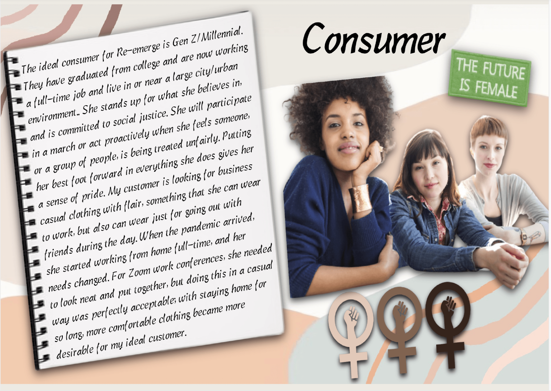 Re-Emerge celebrates, embraces, and lifts up all women. Re-Emerge embraces all skin colors, shown through models used in ads and product sales, and body positivity, with size inclusivity up to 4X. Re-Emerge’s style is inspired by the fashion of the women’s suffragette movement in the 1920s.